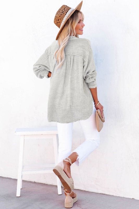 Light Blue Solid Color Button Up Puff Sleeve Casual Pleated Shirt