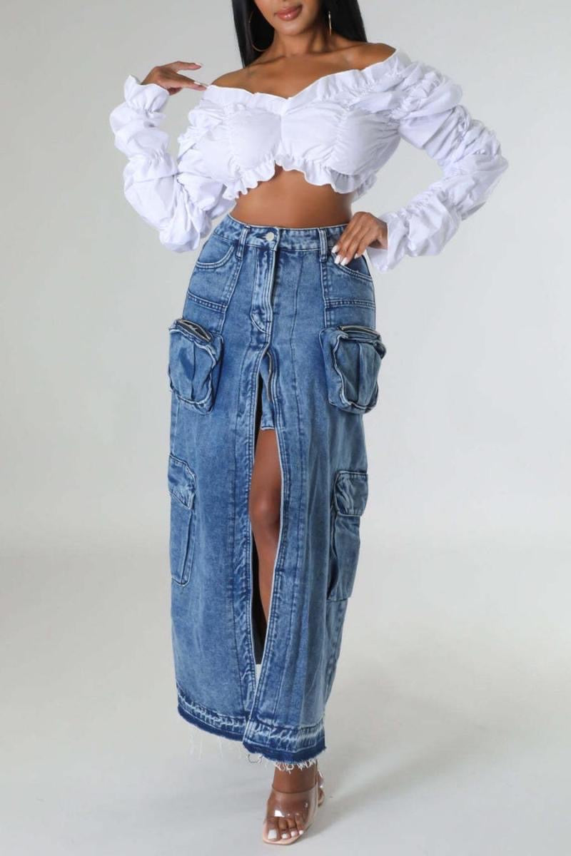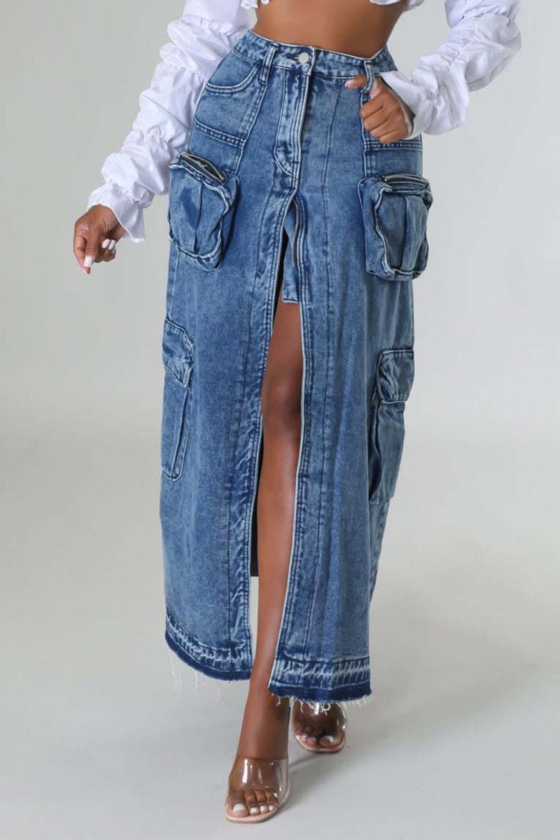 Slight stretch denim high waist slit all-match maxi skirt