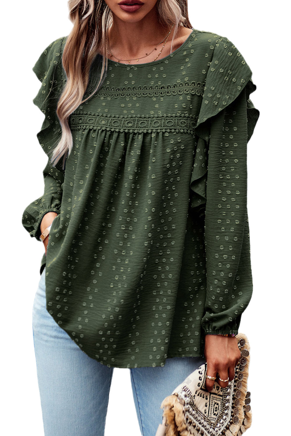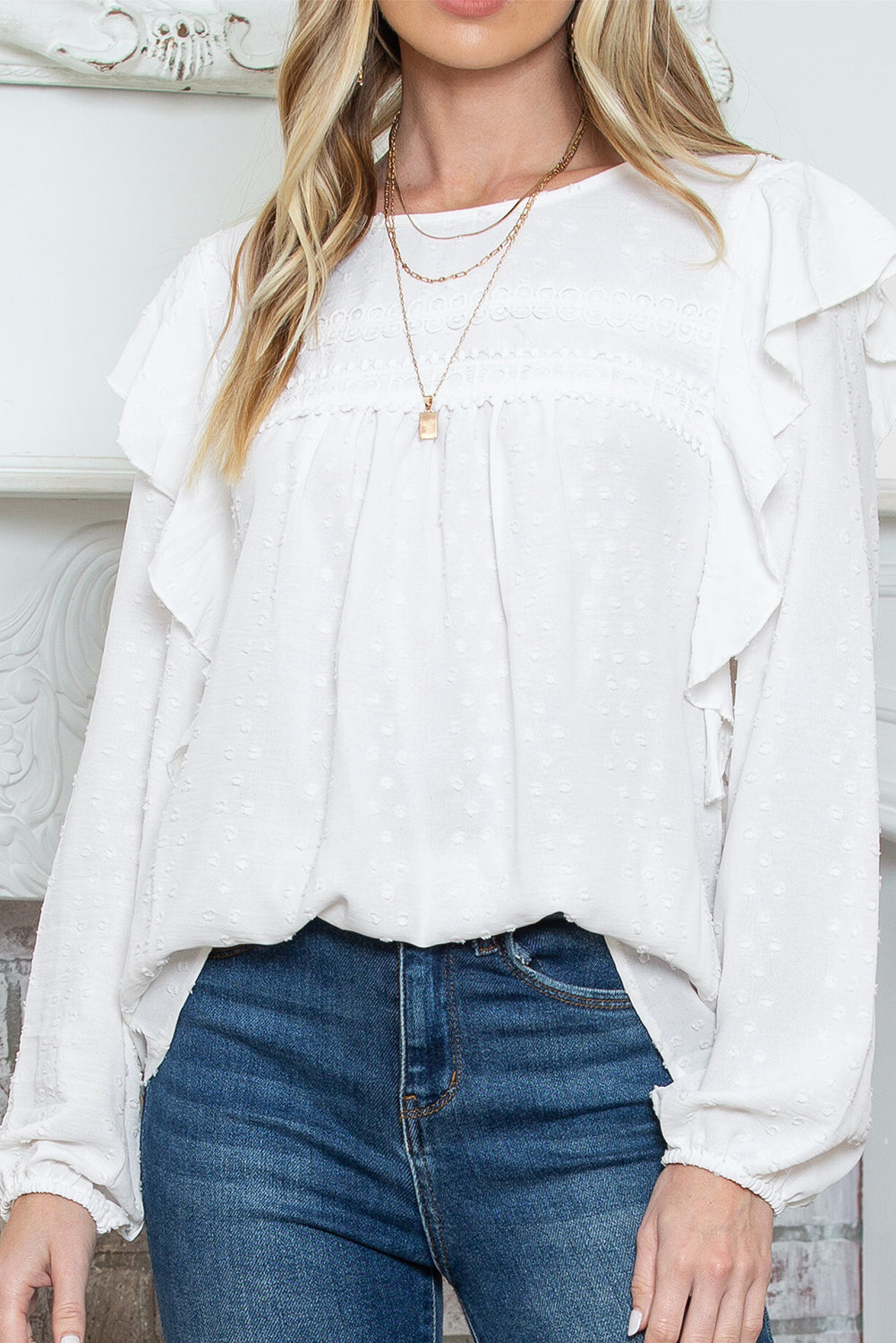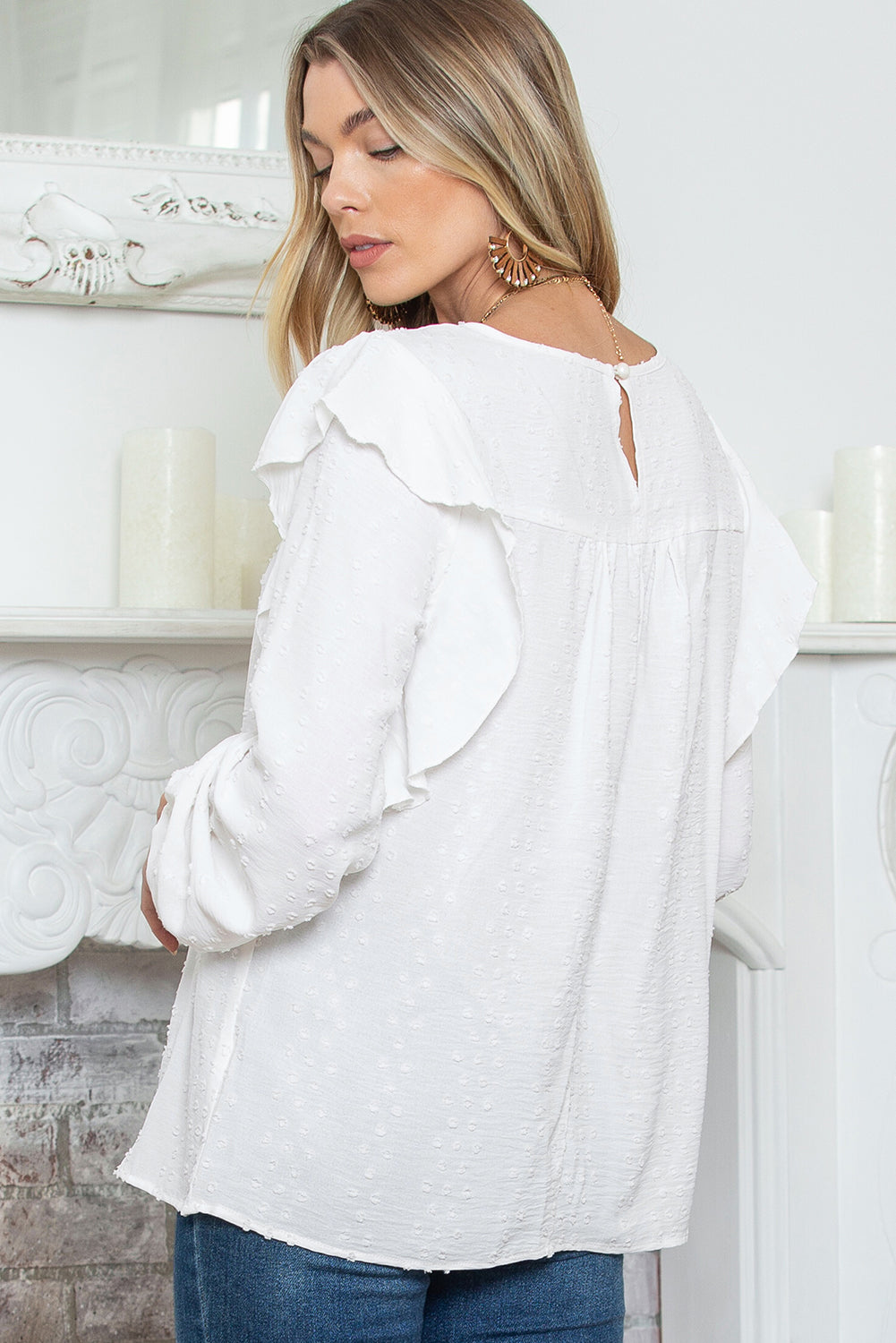 Bright White Swiss Dot Ruffle Shoulder Long Sleeve Blouse