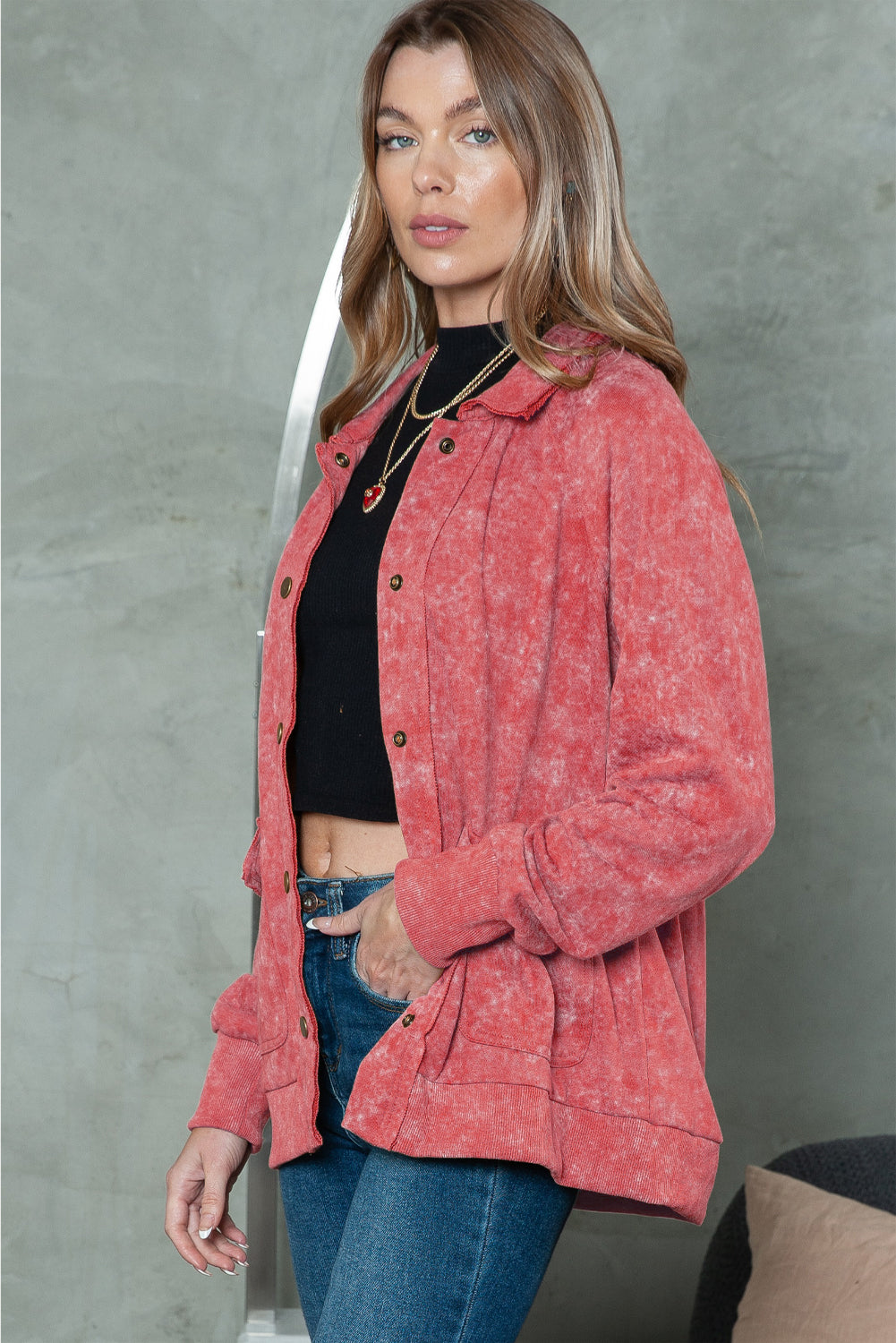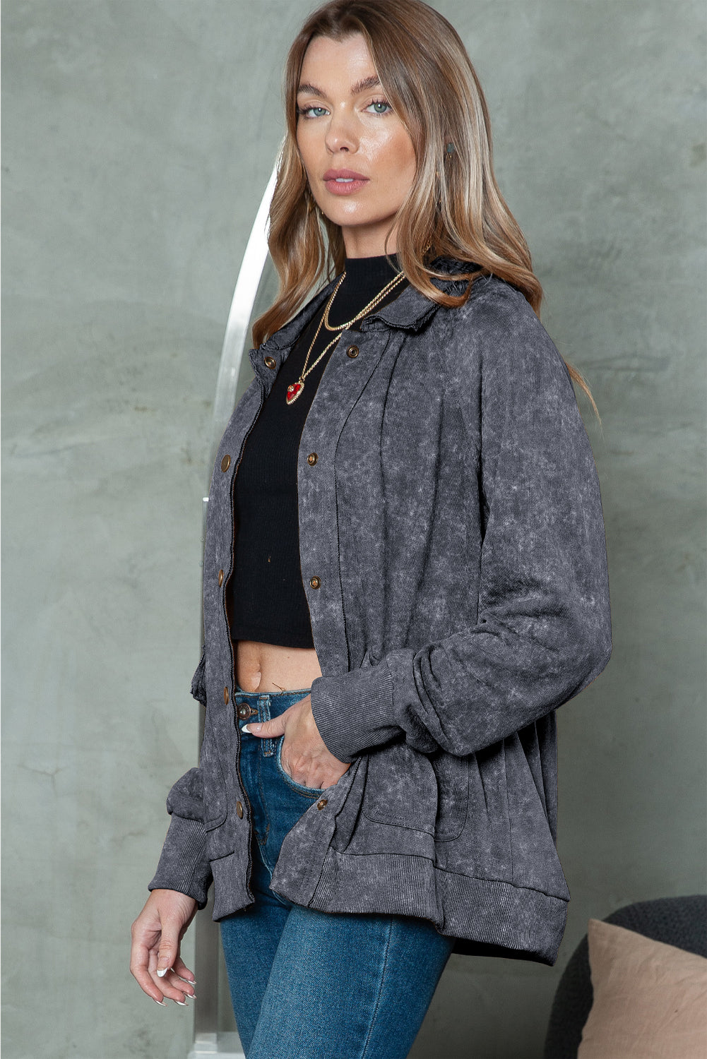 - The flap pockets add a functional yet stylish touch to the jacket.