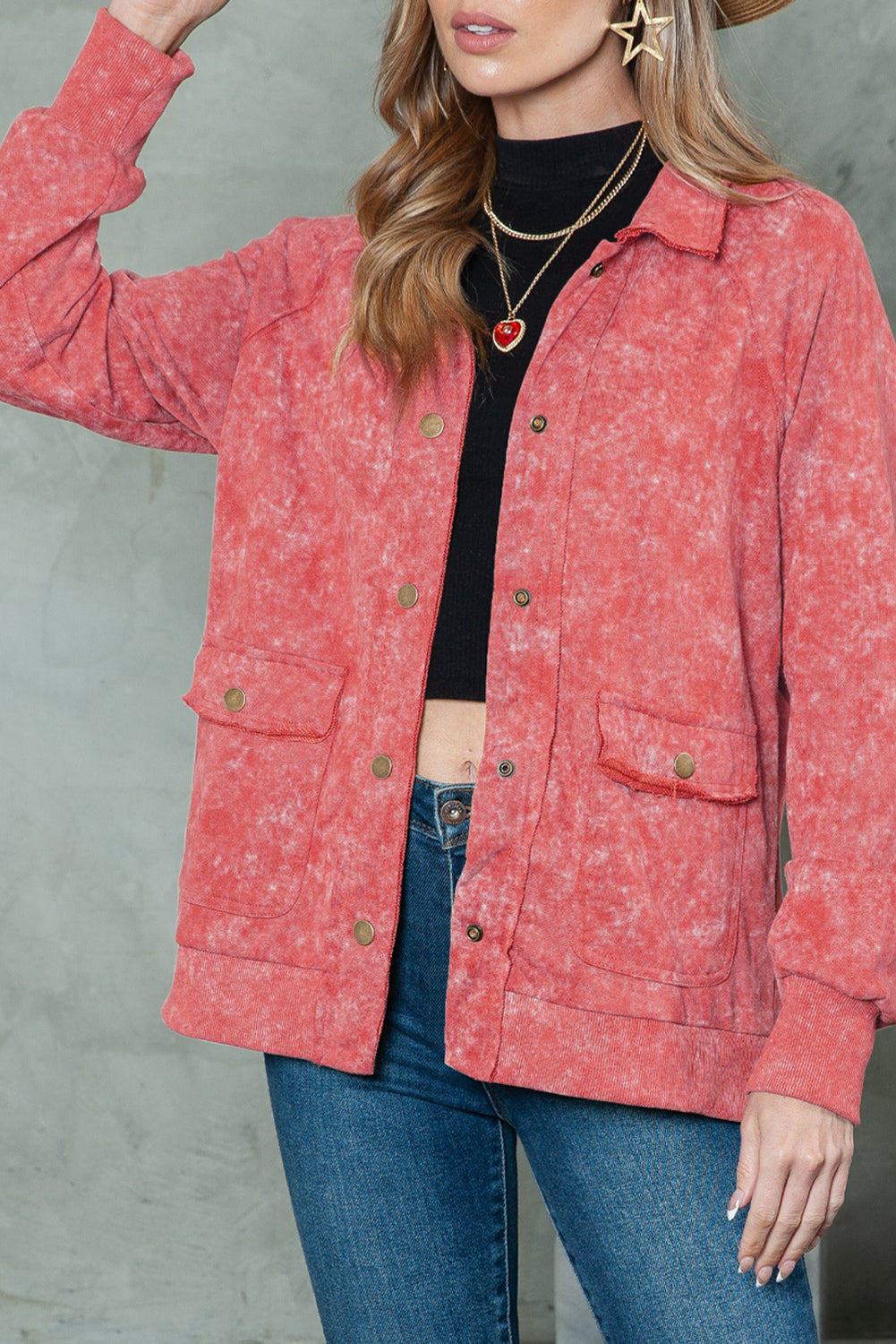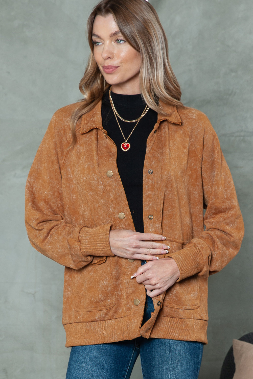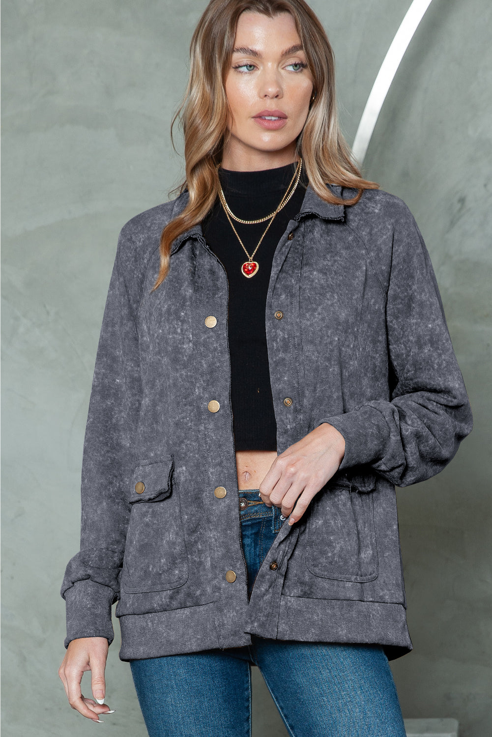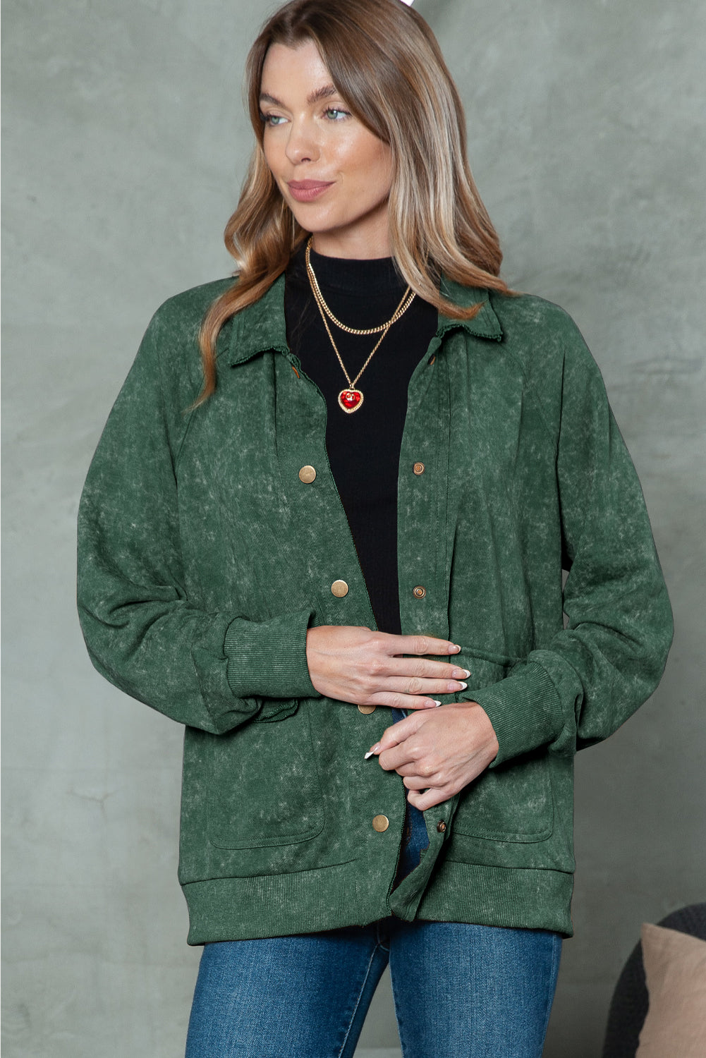 - The jacket features snap buttons and raglan sleeves for added comfort and ease of movement.