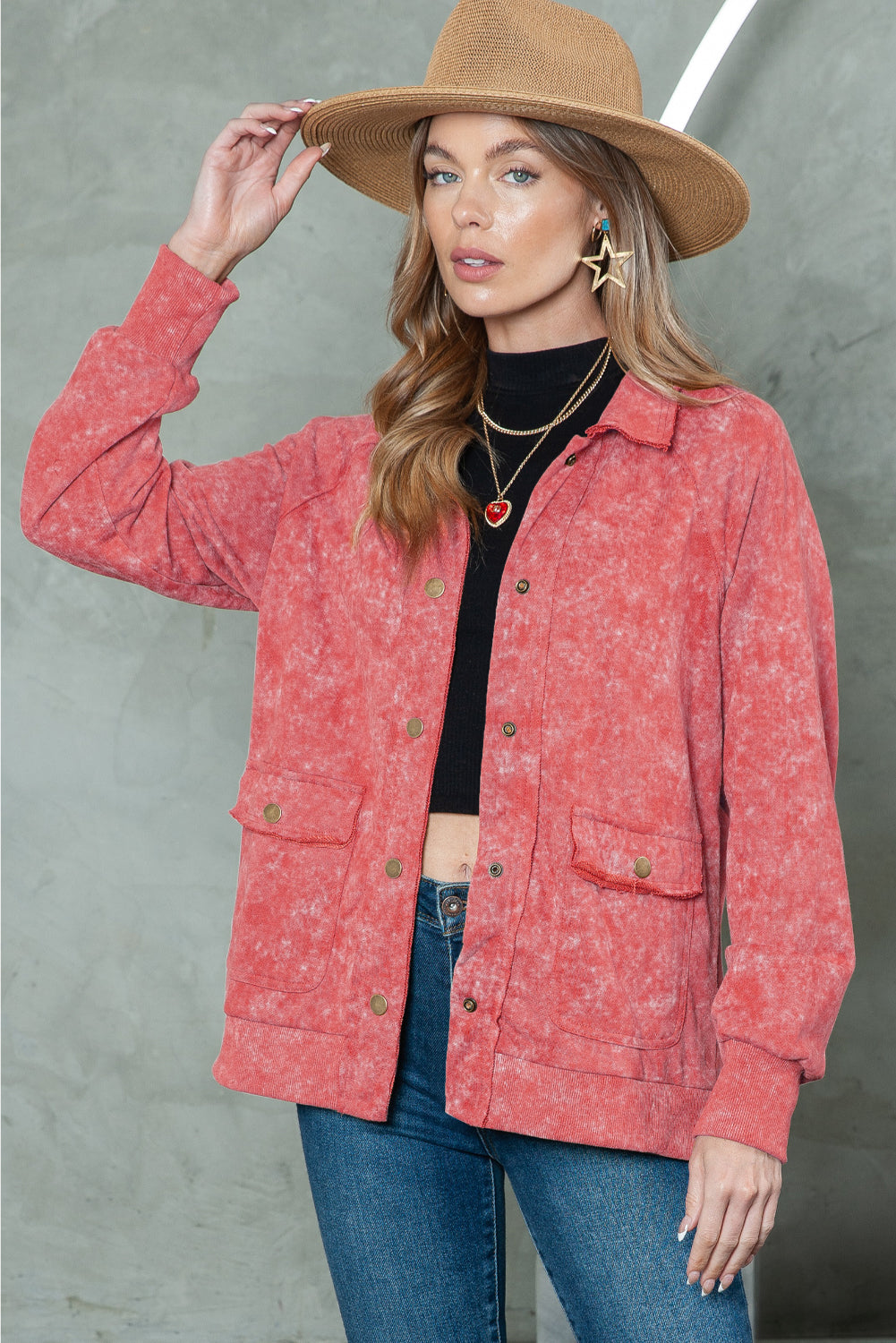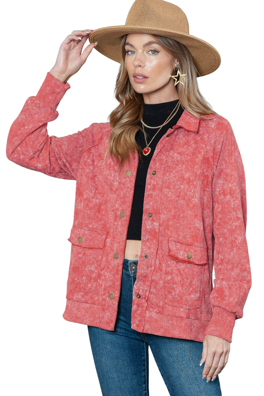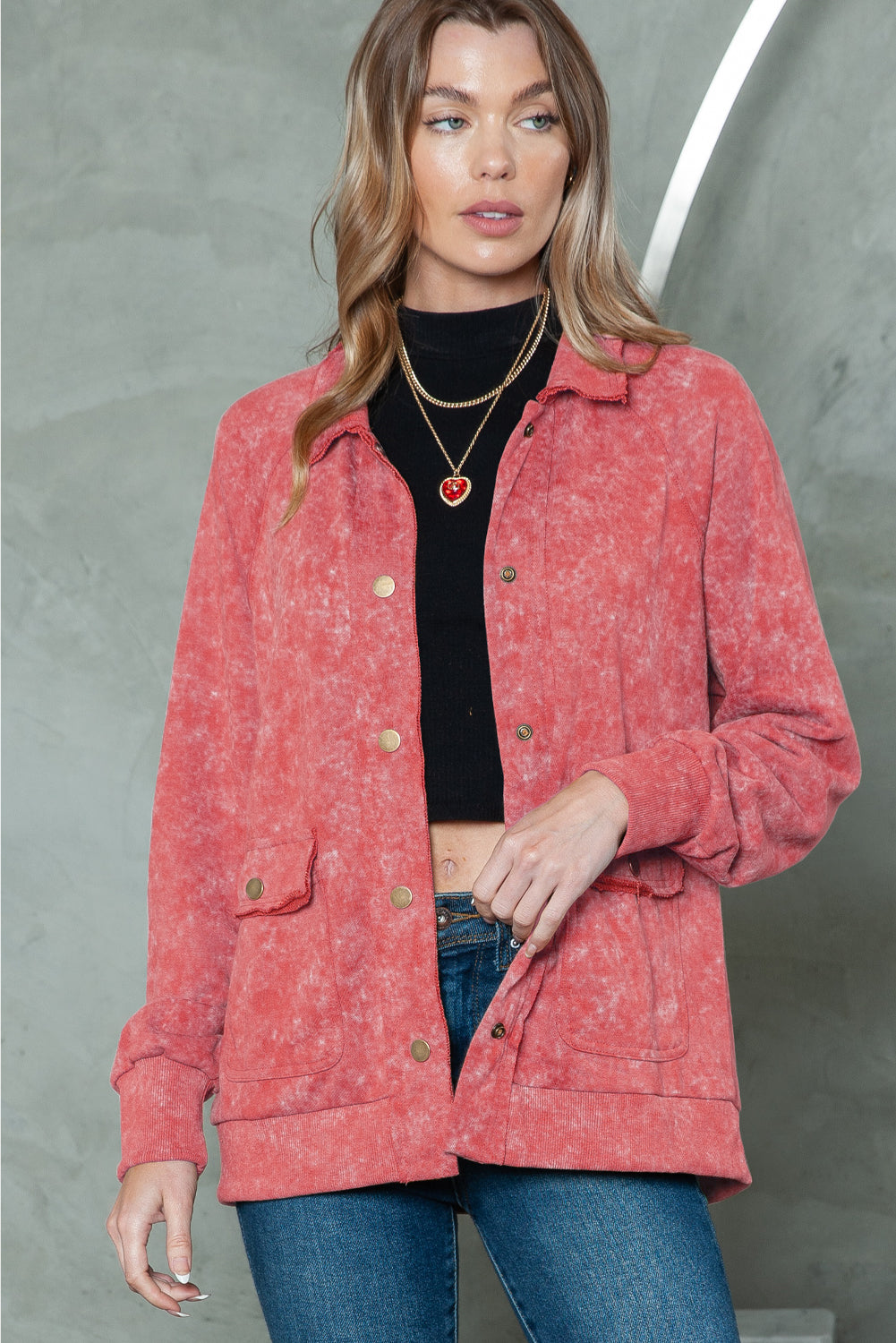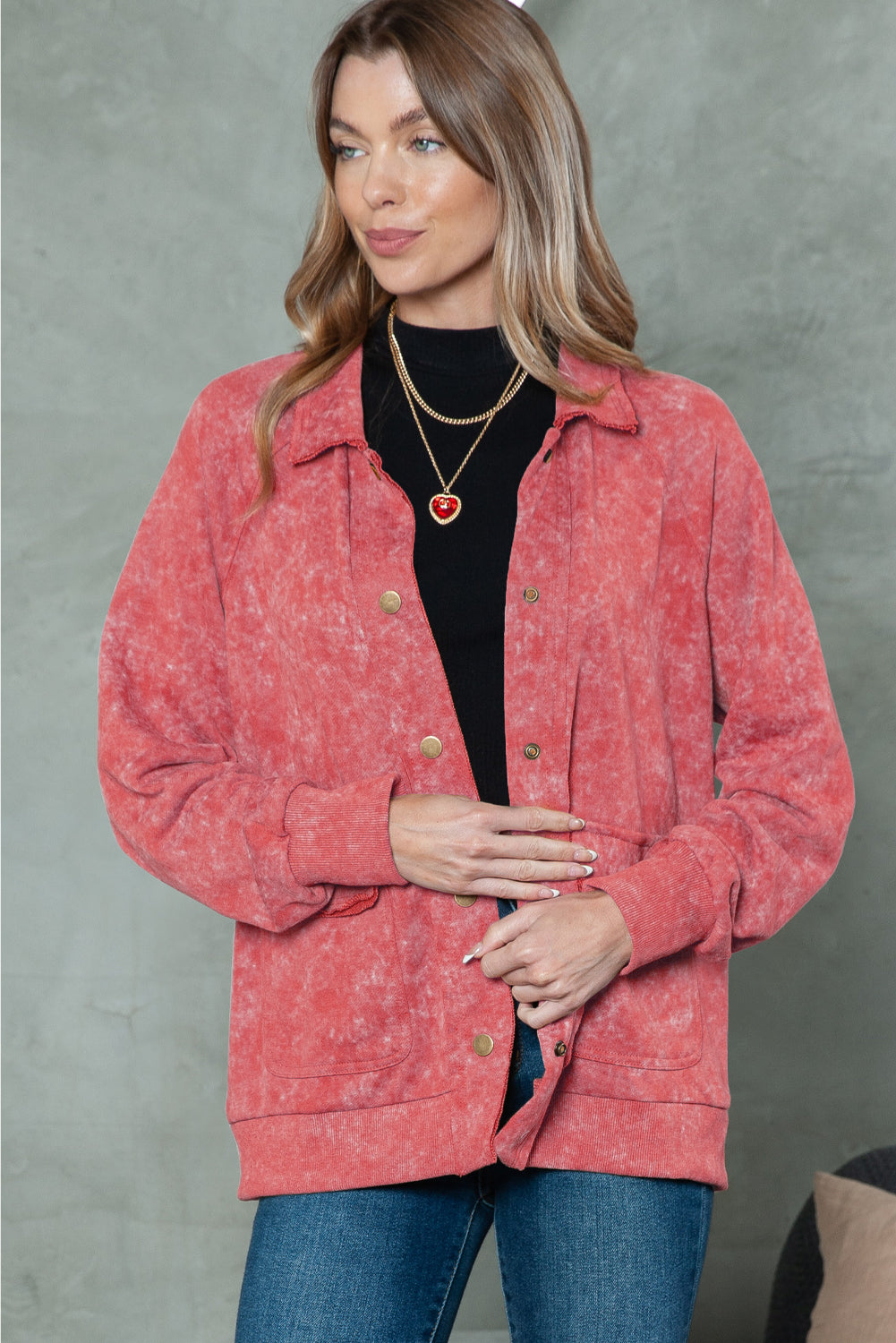 - The jacket features snap buttons and raglan sleeves for added comfort and ease of movement.