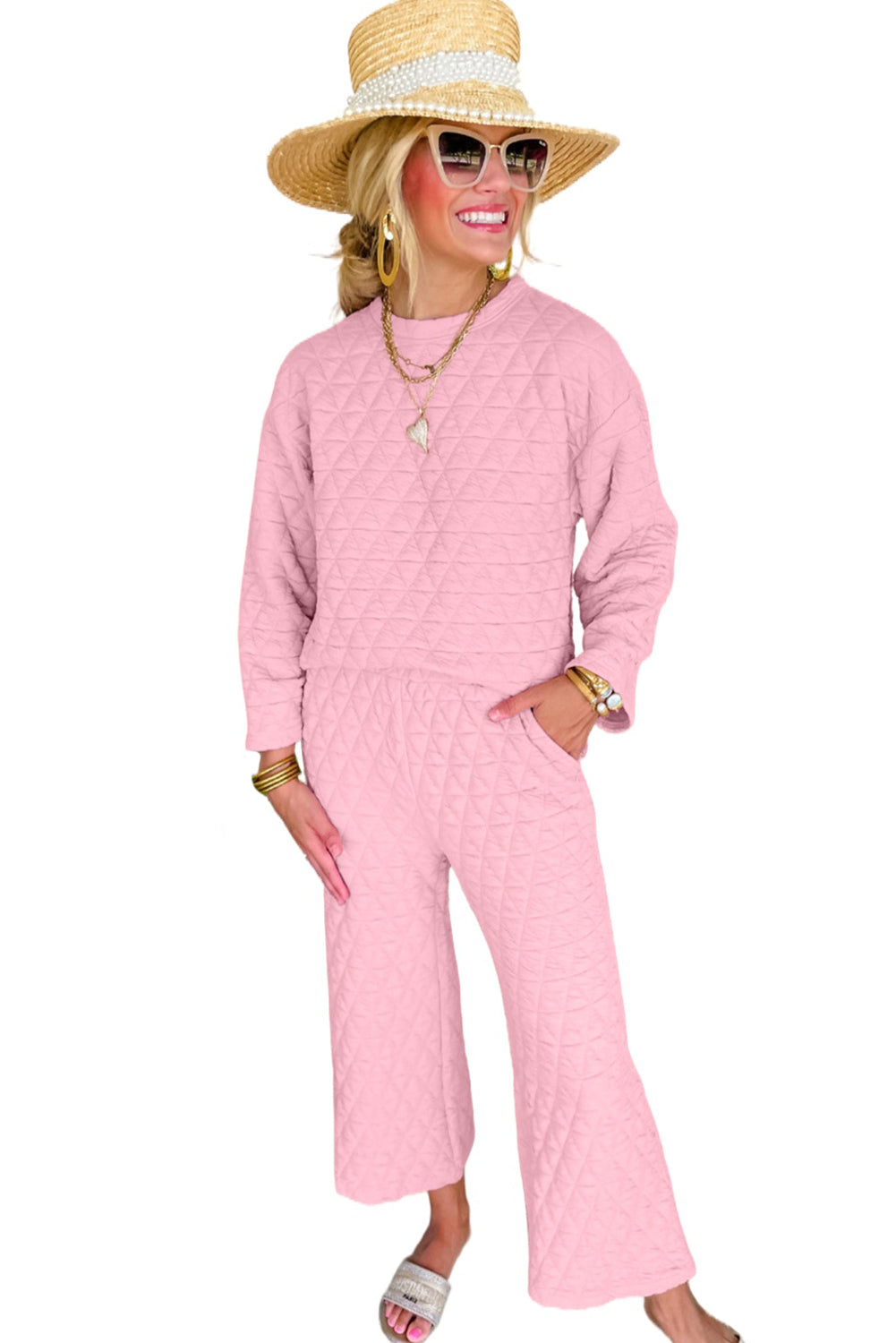 Dark Grey Solid Color Quilted Long Sleeve Top and Wide Leg Pants Set
