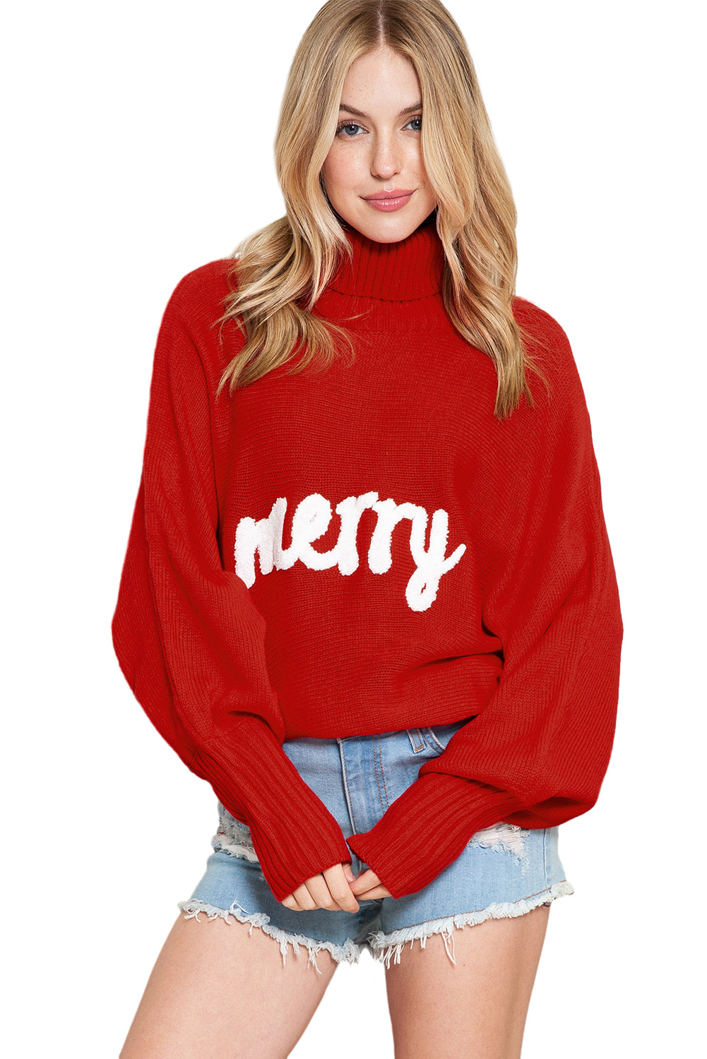 Green Turtle Neck Batwing Sleeve Merry Christmas Sweater