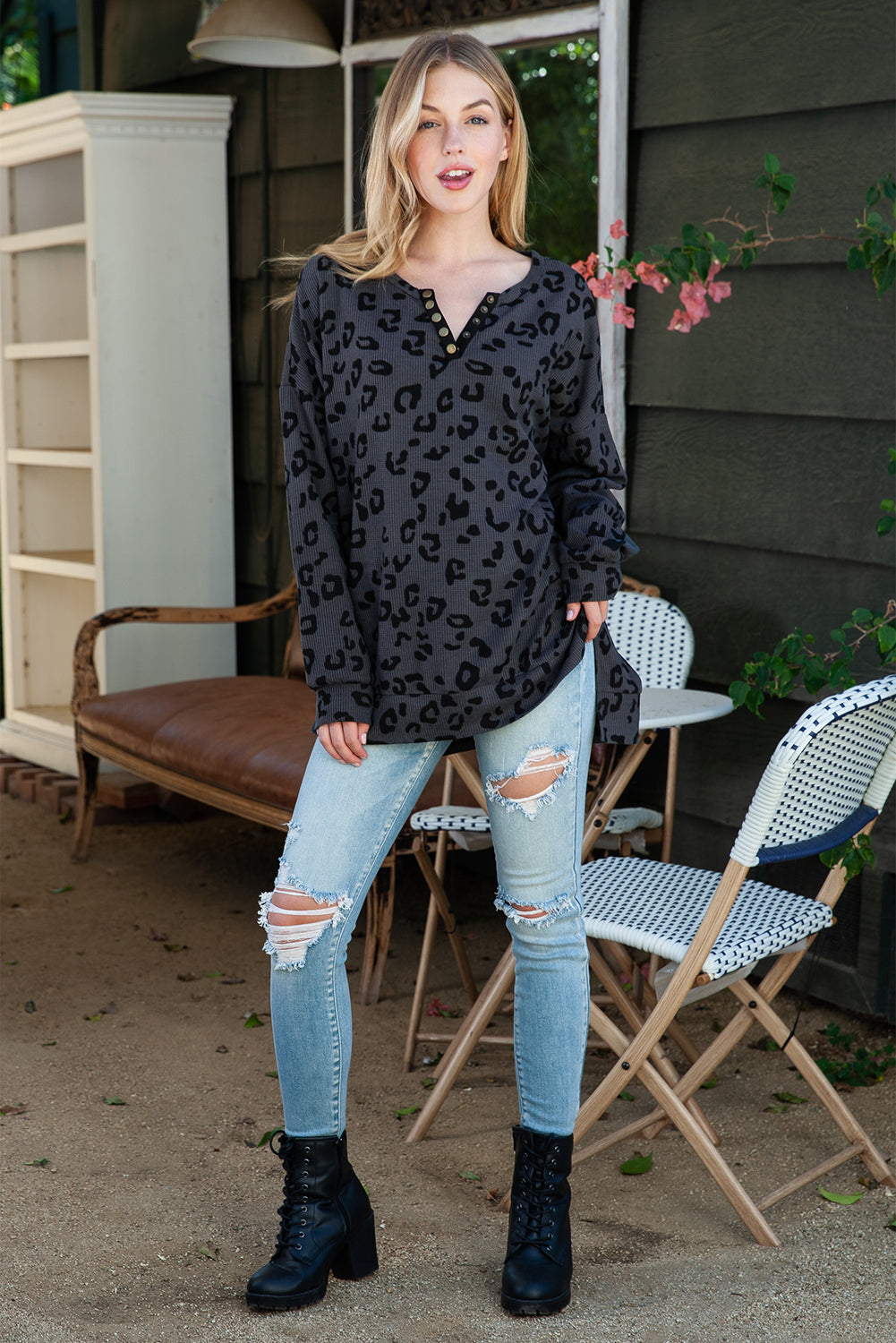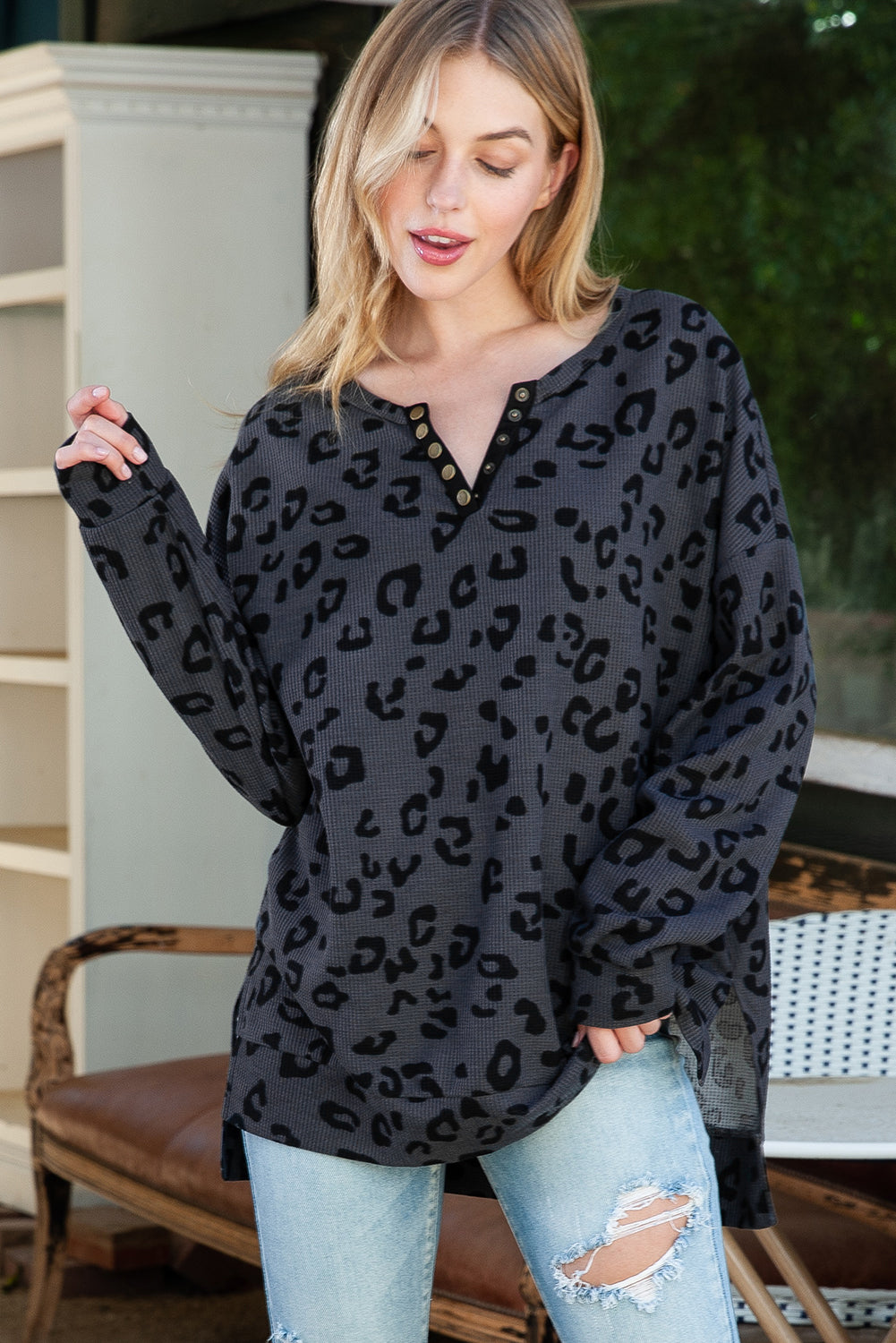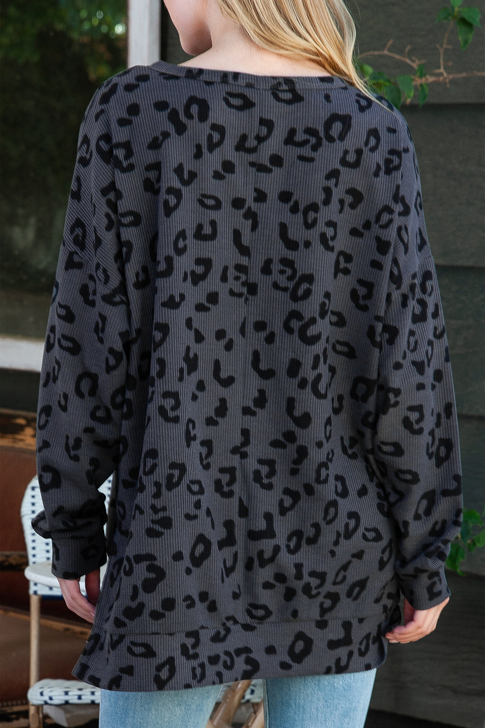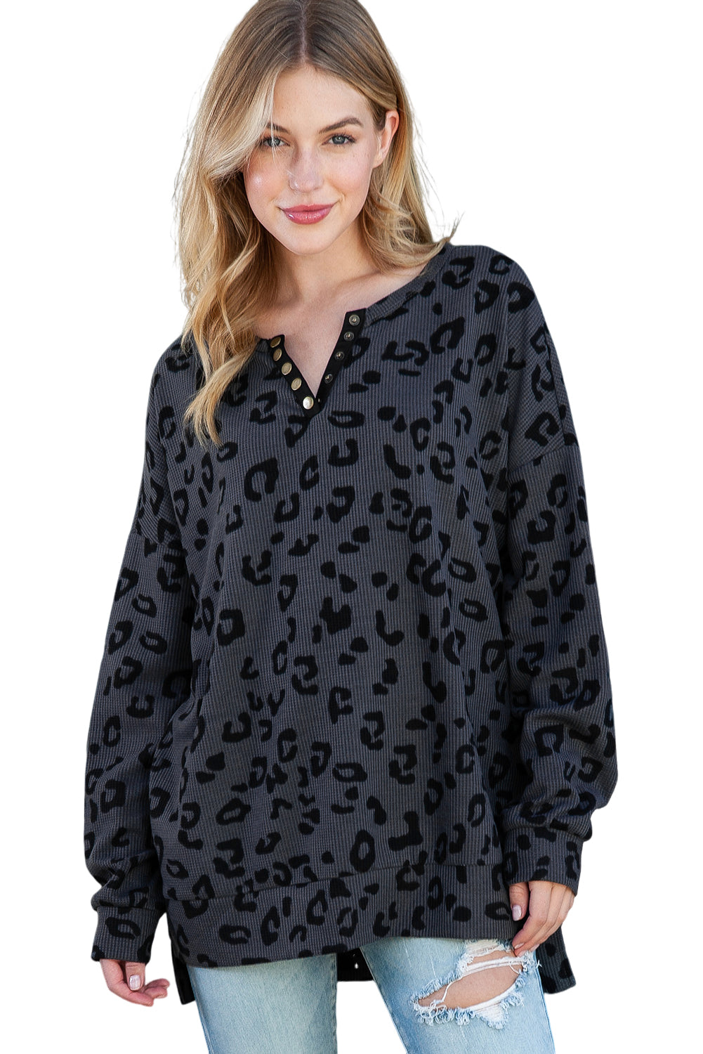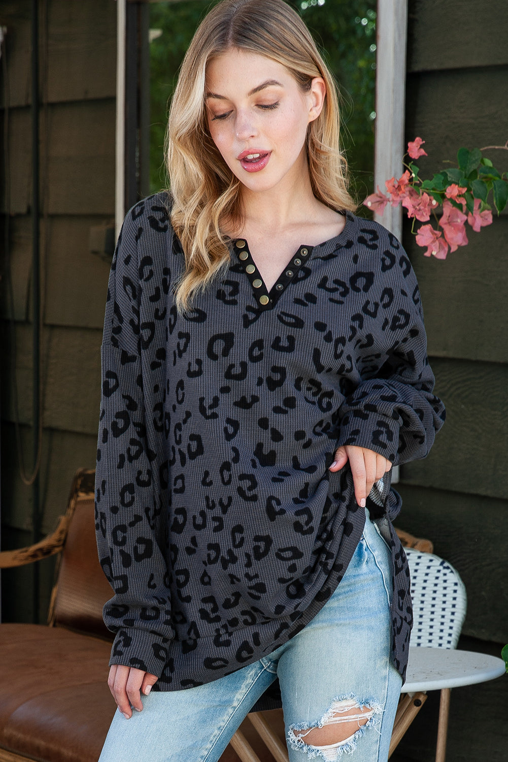 Grey Leopard Print Textured Drop Shoulder Henley Shirt