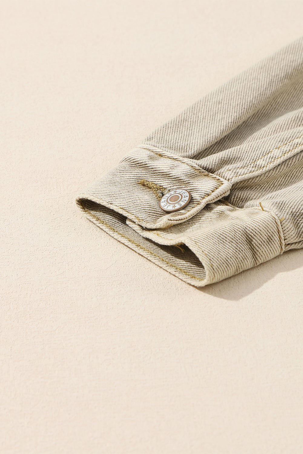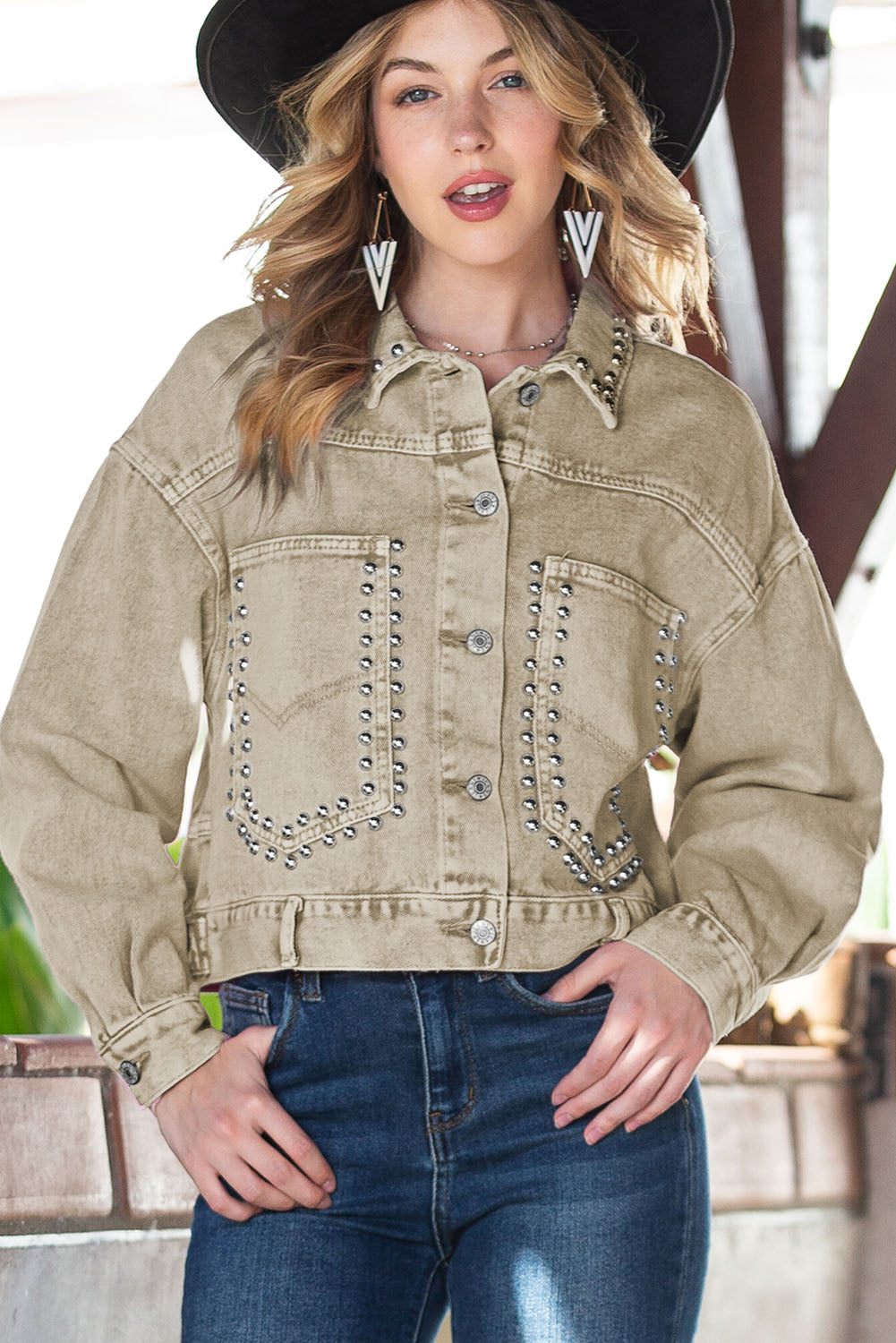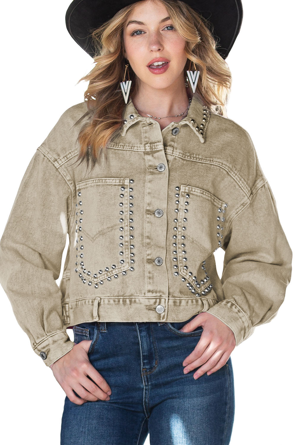 Khaki Rivets Pocketed Cropped Denim Jacket