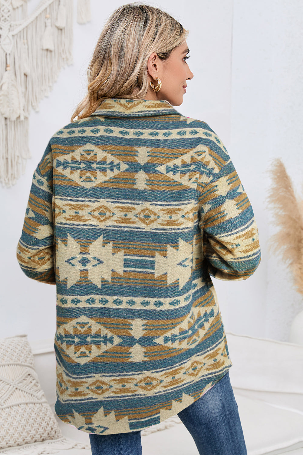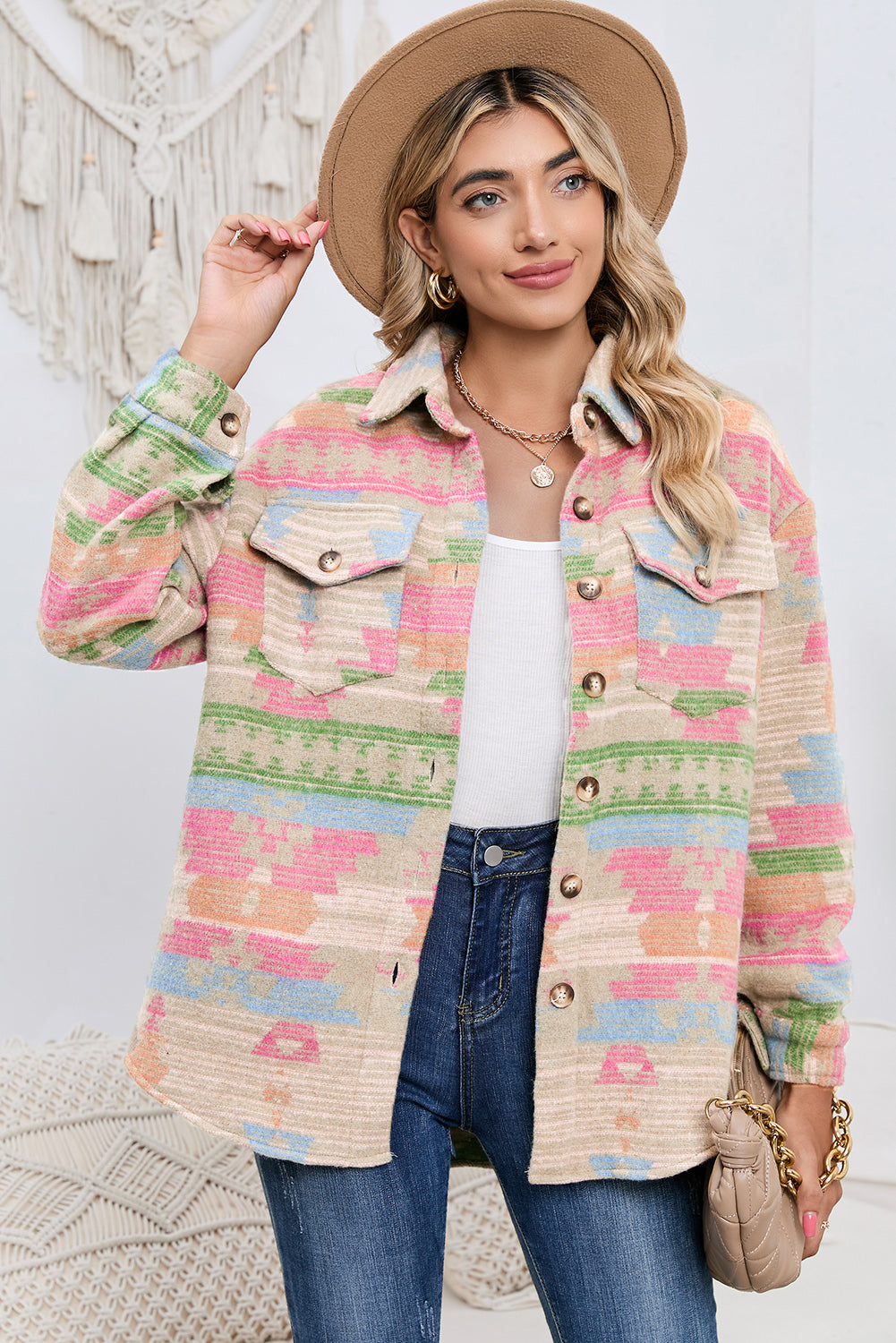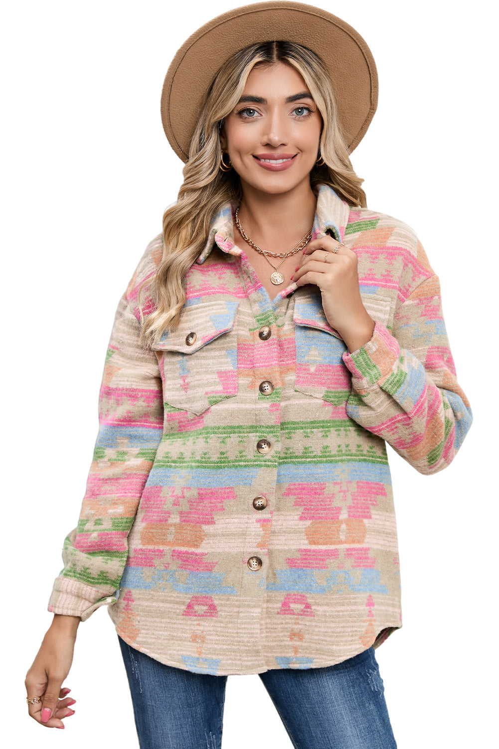 Multicolor Button Up Flap Pockets Geometric Jacket for Women