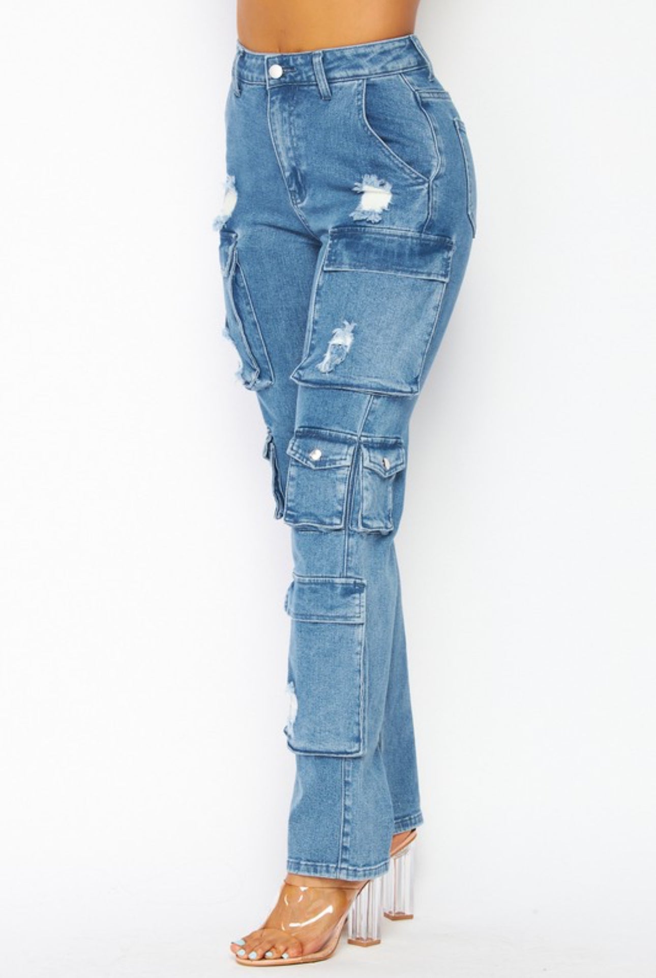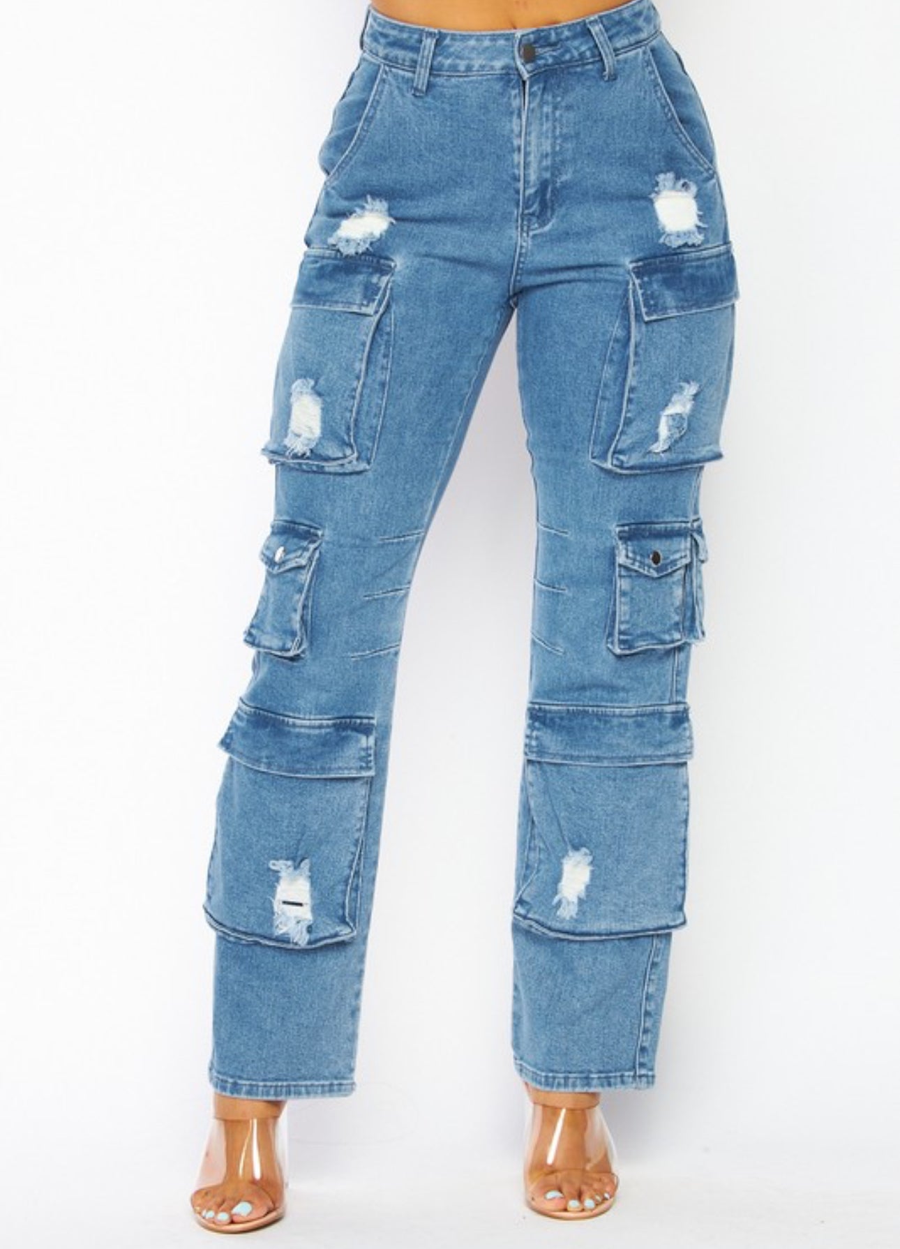 Stretchy Leg Cargo Pocket Denim Jean Pants