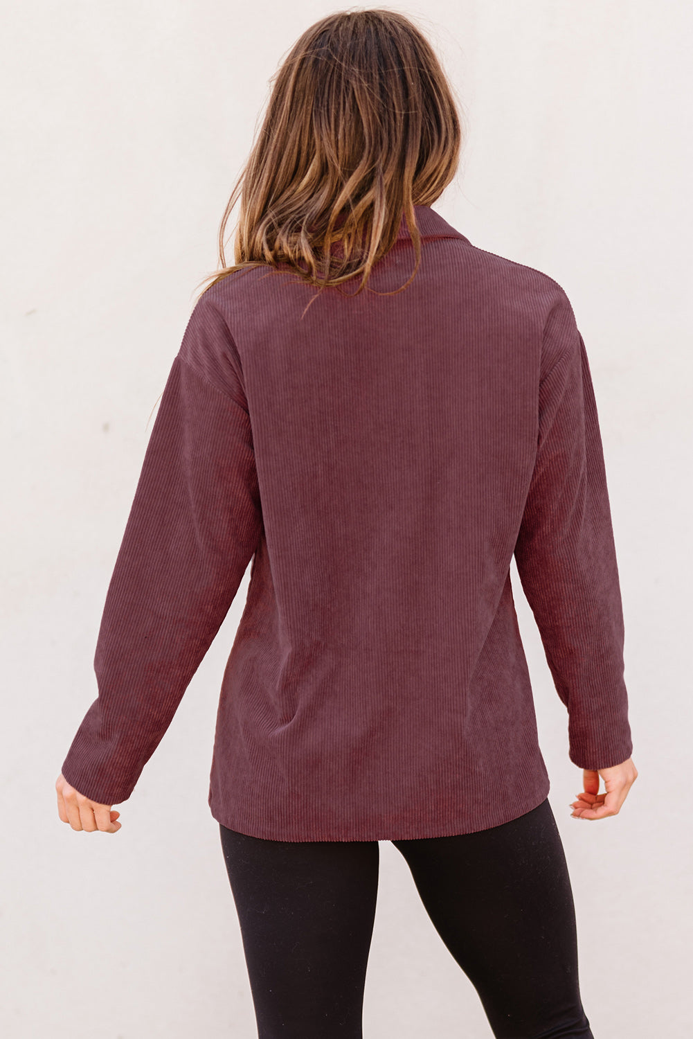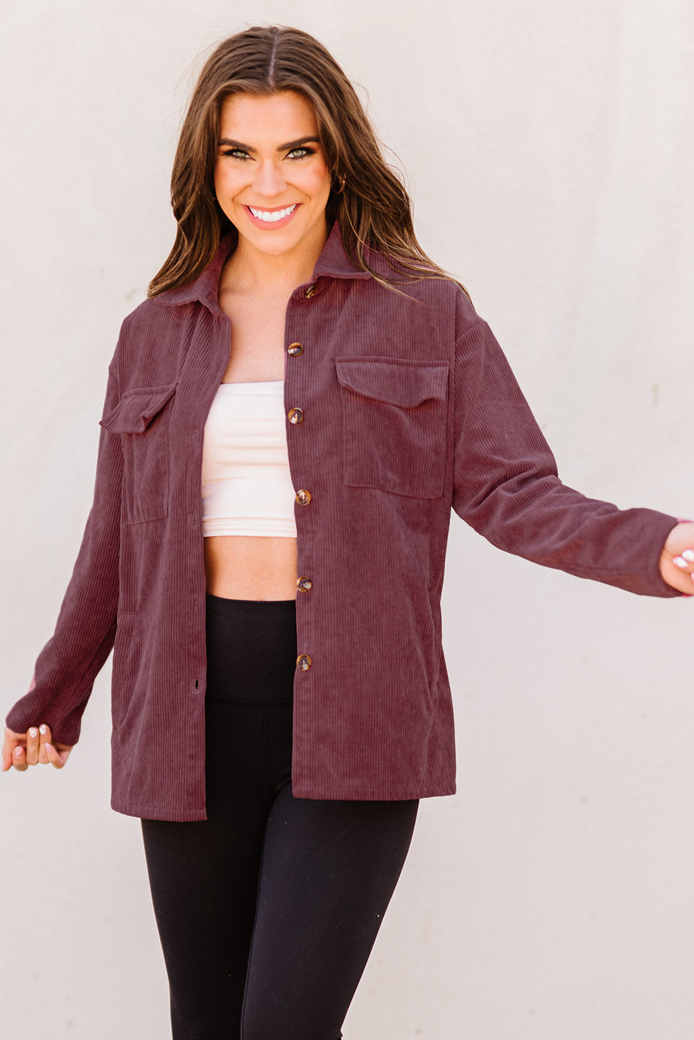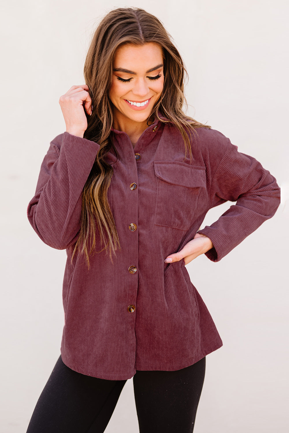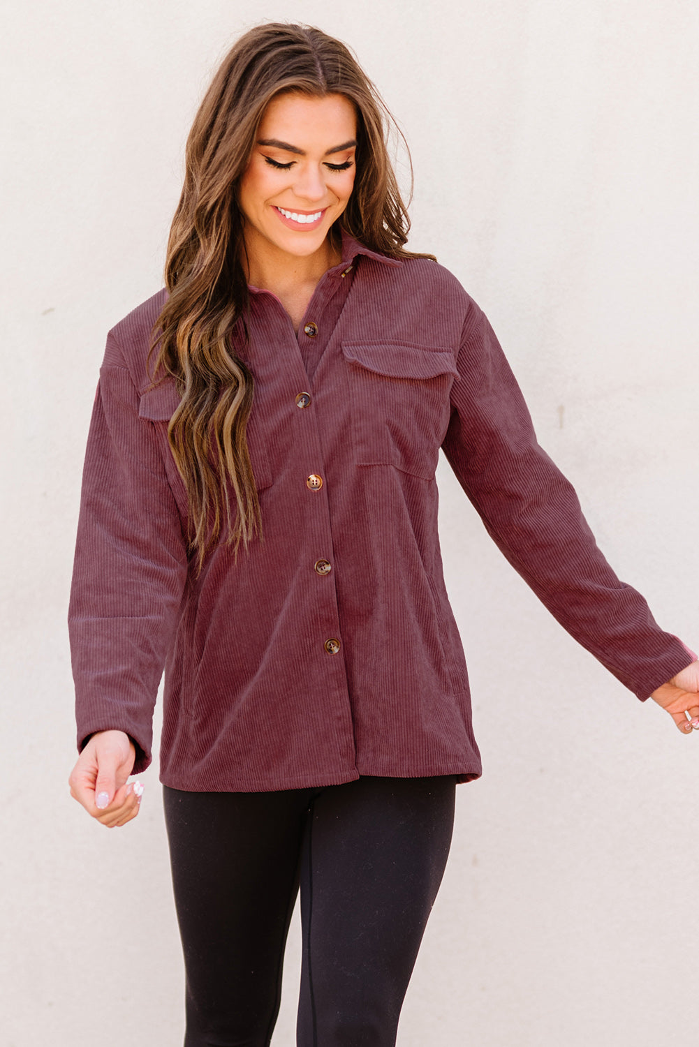 Plum Button Up Patch Pocket Corduroy Shacket