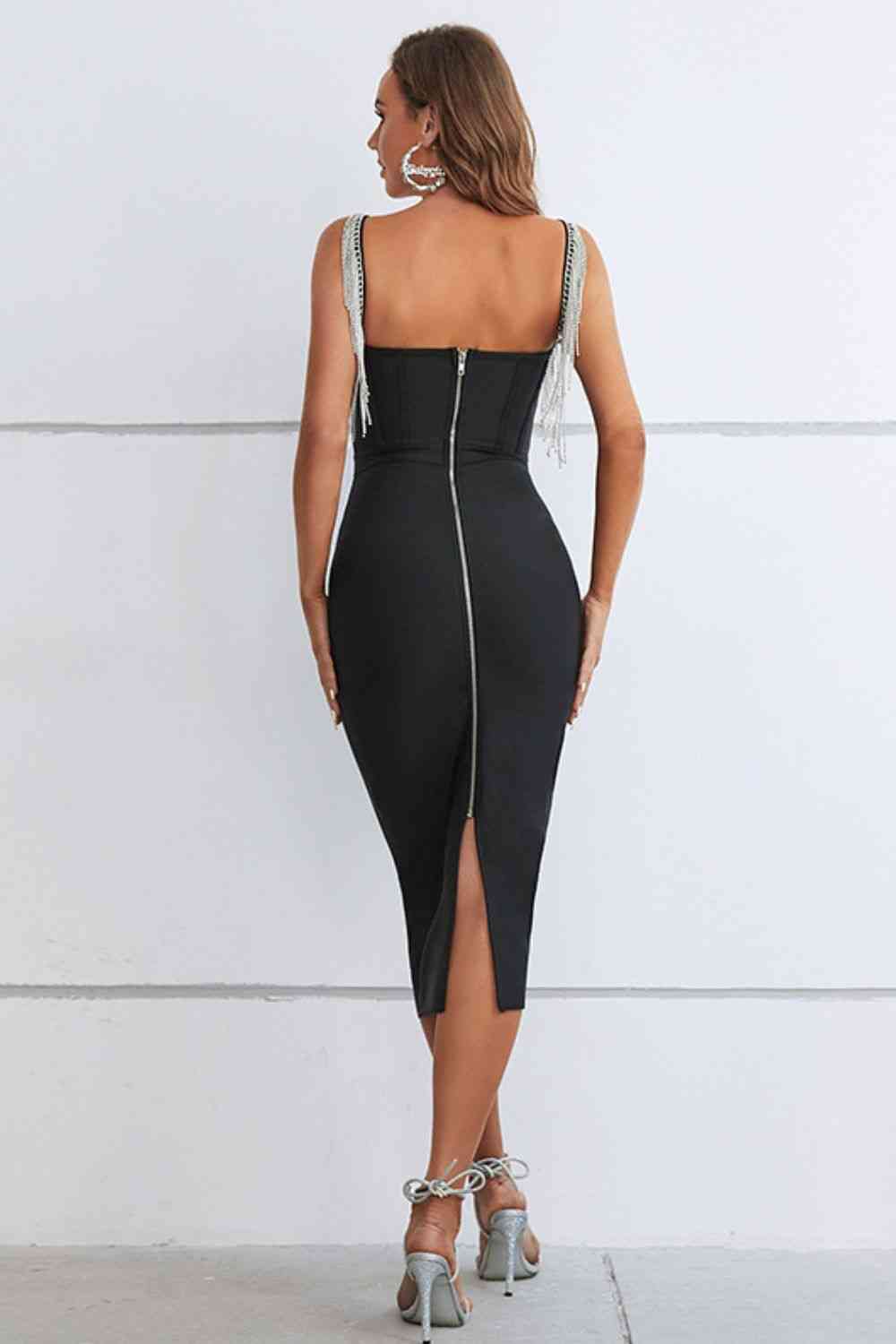Rhinestone Fringe Sweetheart Neck Slit Dress