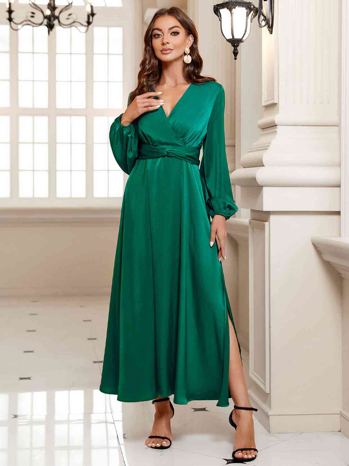 Surplice Long Sleeve Slit Midi Dress